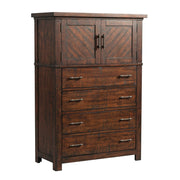 The Jax 5-Drawer Chest is the perfect rustic piece for your bedroom! This vertical chest comes with four, large spacious drawers and one cabinet up top. This rustic chest comes in a rich, cherry color and features distressed markings throughout. Dark bronze drawer pulls make it easy to get to... Read More